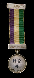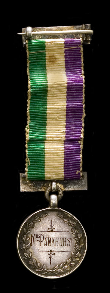 On the front of the medal were details of where Mrs Pankhurst had been imprisoned, ‘Holloway’, Hospital block, second floor, cell 4 – abbreviated to ‘H.2 4’. The date on the bar of the medal 8th October 1908, is the date the police issued the original summons.