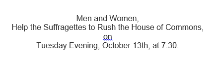 Emmeline Pankhurst records that the police were present at the rally and had them under close surveillance, taking notes of the proceedings and following them [Emmeline Pankhurst My Own Story]. The next day the three women were served with the summonses instructing them to attend Bow Street police station that afternoon. They did not attend, instead going to a WSPU meeting in Queen’s Hall. Although the police were present at this meeting they did not arrest the women, but again left instruction that they should attend Bow Street the following morning, the 13th, the day of the ‘rush’. Again the women failed to attend, remaining at large the whole day, but when they returned to the WSPU offices at 6pm the police arrested them. They consequently were unable to attend the ‘rush’ themselves.