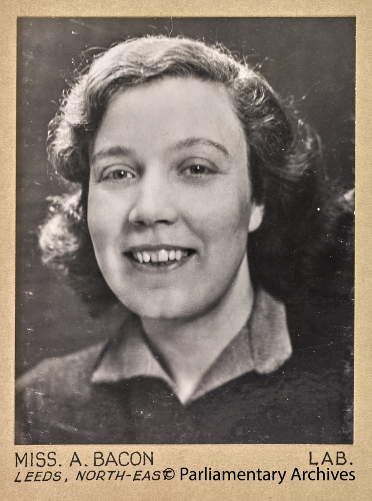 Alice Bacon grew up in a Labour-supporting Yorkshire mining family and joined the party at 16. A teacher by profession, she was an active member of the National Union of Teachers and became president of its West Yorkshire county association in 1944. She was elected in 1945 for Leeds, North-East and served there and in Leeds, South-East until 1970.